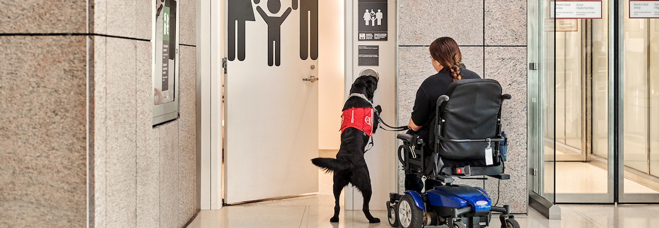 Toutes les toilettes et les toilettes familiales à Toronto Pearson incluent des toilettes accessibles aux fauteuils roulants, quelquefois appelées « toilettes pour handicapés », à l’étranger.